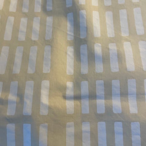 Hetken pöydällä ollut kangas, juuri pesty, hieman ruttuinen pesun jäljiltä.