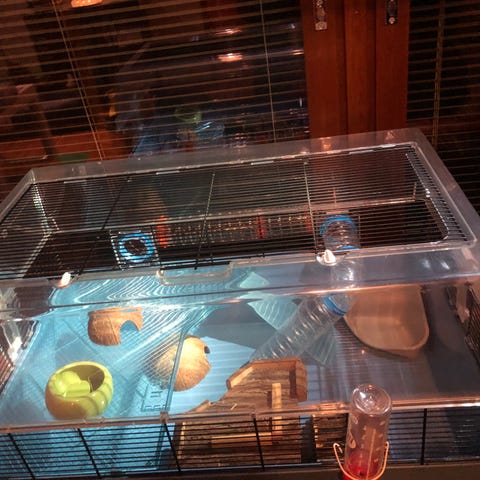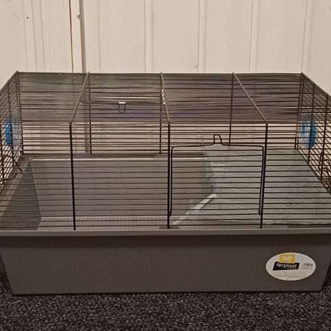Hamsterin häkki, kuljetuslaatikko ja tarvikkeita. Häkin koko leveys 71,5cm, syvyys 46cm ja korkeus 31cm. Häkissä on kätevä avattava yläosa, jonka ansiosta lemmikin hoitaminen on helppoa.