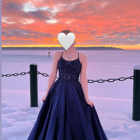 Tanssin 2024 eikä mekkoa ole sen jälkeen käytetty. Mekon mukaan saa vannehameen sekä puvun oman pukupussin.