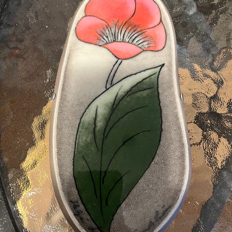 Arabia seinätaulu koriste-esine, jossa on keltainen ja oranssi kukkakuvio sinisellä taustalla. Esine on valmistettu keraamisesta materiaalista.