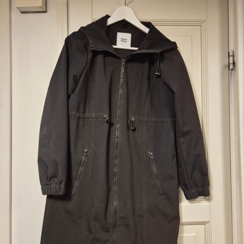Virheinä takissa on kuitenkin kantopaneelissa irronneet kiristyskuminauhat. Toinen nappiin kiinnitettävä kuminauha on itse ommeltu takaisin kiinni takkiin. Ympyröity punaisella kuvaan. Ei kuitenkaan haitannut minulla käyttöä.