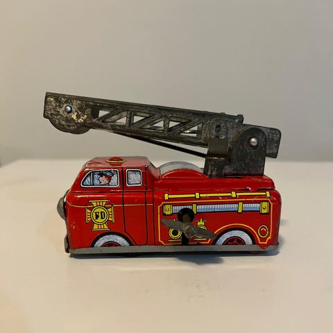 Palomiesaiheinen peltiauto tikkailla