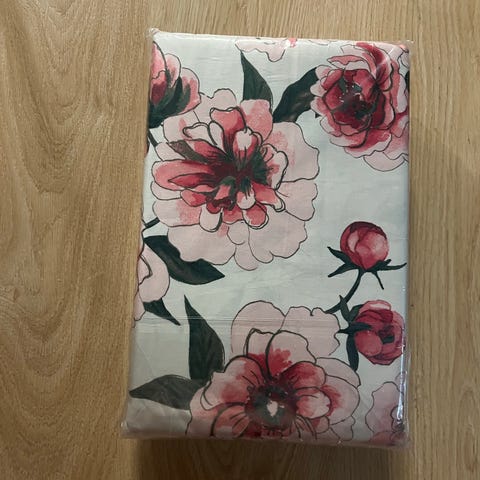 Uusi ja käyttämätön pussilakanasetti. Valkoisella pohjalla on vaaleanpunaisia kukkia. Paketti sisältää kaksi kappaletta pussilakanoita ja tyynyliinoja. 100% puuvillaa.