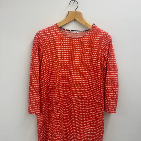 Marimekon pussukka pikku räsymatto mekko, koko XL. Vain käyttöön pesty. Olalta helmaan 97 cm, kainalosta kainaloon 58 cm, lantio 67 cm.