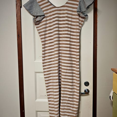 Toppi, jossa röyhelörypytystä edessä ja hartioilla. Luomupuuvillaa 92% elastaani 8%. Valkoinen on puhtaanvalkoinen, ei luonnonvalkoinen. Kainaloissa ihan pientä tummentumaa, laitoin kuvan.
