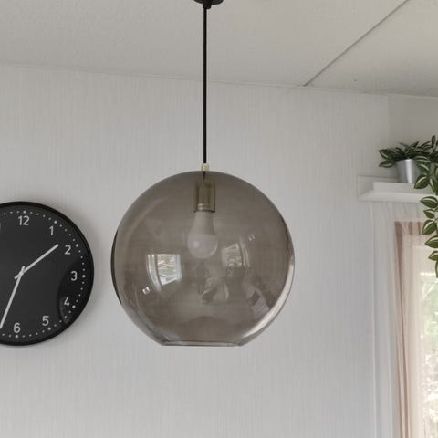 Valkoinen lasinen lamppu. Sisällä neutraalin sävyinen led, tulee kaupan mukana. Hyväkuntoinen.
