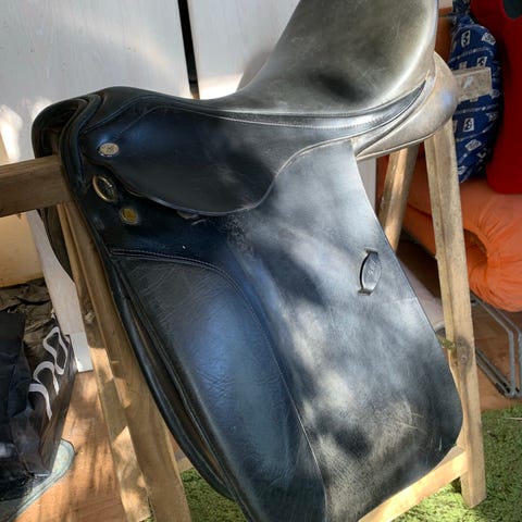 Normaalilevyinen koulusatula kaarevahkoon selkään 17" istuimella ja hyvällä selkärangantilalla. Siivessä jokunen tikkaus auennut, mutta hyvässä käyttökunnossa. Kysy tarvittaessa mukaan jalustimia, remmejä ja satulavyötä.