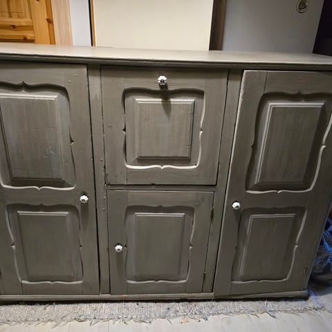 Puinen kaappi on yhdistetty kahdesta eri osasta. Maali on paikoin kulunut etenkin alakaapin pinnasta. Yläkaapin lasittomat ovet ovat tiukat, vaatii vähän kunnostamista.