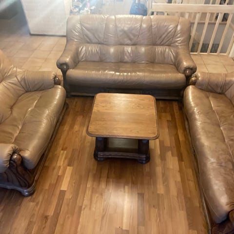 Kotimainen Laulumaan tehtaalla Rautalammilla tehty sohvaryhmä, joka on todellakin tehty kestämään. Tässä ryhmässä on kaksi erillistä sohvaa, jotka voidaan liittää kuvassa olevalla kulmapalalla toisiinsa. Pakettiin kuuluu myös rahi. Sohvat teetetty 2014, kulmapala ja rahi 2018. Vahvat massiivipuurungot ja jousille oli muistaakseni ikutakuu tai ainakin jotain sinne päin.