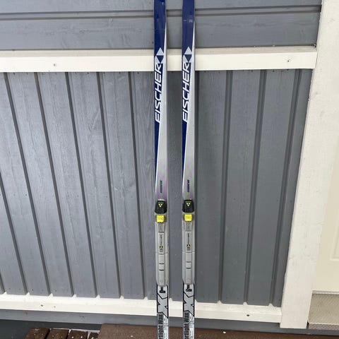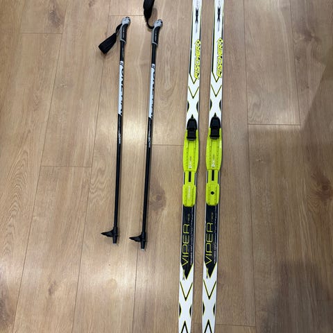 Fischer sukset 147cm pitkät, Rottefella NNN siteillä ja Rex 115cm sauvoilla. Suksipaketti lapselle.