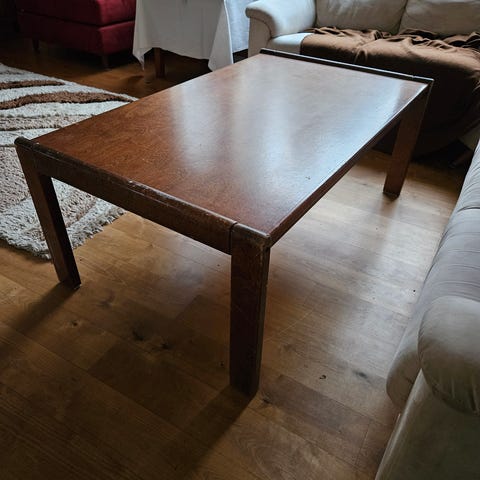 Kuvanmukainen sohvapöytä. Tarina kertoo, että olisi Eero Aarnion suunnittelema. Itsellä ei ole kuitenkaan täyttä tietämystä asiasta. Anopin jäämistöä. Käytönjälkiä löytyy, koska ollut alusta asti käytössä samassa perheessä ainakin n.40-50 vuotta.