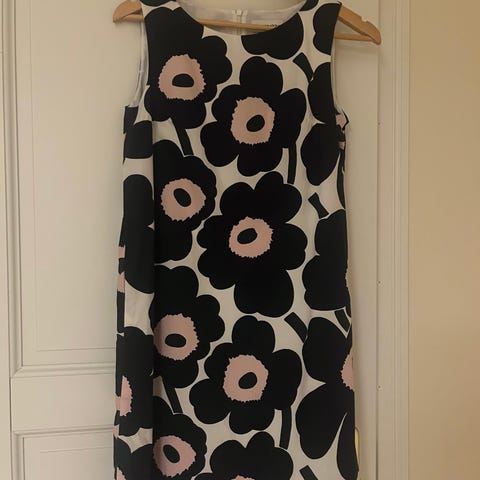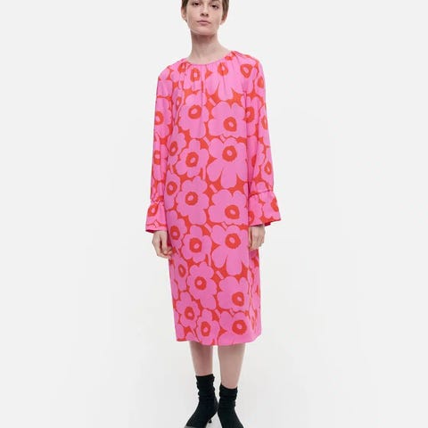 Marimekon uusi Majolika-mekko. Pinkki-oranssi, niukka istuvuus. Koko 46, vastaa kokoa 42-44. Siluetti suora. Tuonti Helsinkiin onnistuu tietyllä aikataululla. Ovh 300.