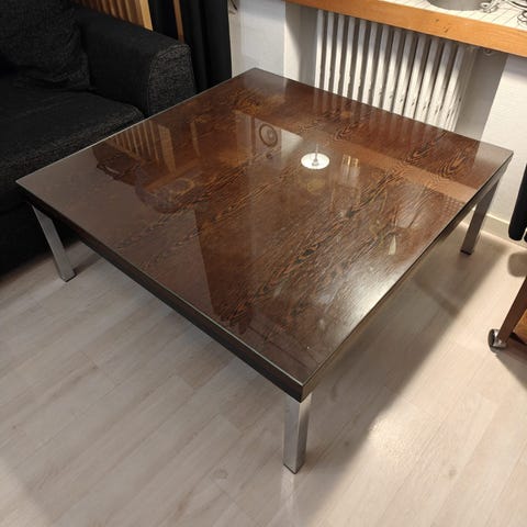 Pöytä tulee kantaa itse ja se pitää kantaa puoli kerrosta portaita alas katutasolle. Saa tarjota ja tulla katsomaan ennen ostopäätöstä.