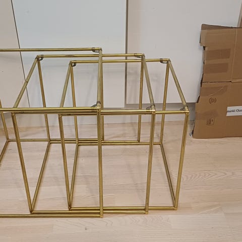 Upea lasinen design sohvapöytä. Pöytä on hyvässä kunnossa. Pöydän jalat ovat messingin väriset ja kauniin muotoiset. Arvelen, että voisi olla vintage/retro. Pinnassa on joitakin käytöstä tulleita naarmuja.