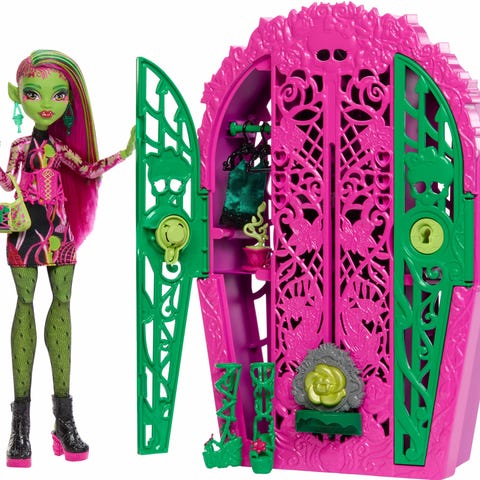 Monster High Skulltimate Secrets Garden Mysteries Venus McFlytrap -nukkesetti, johon kuuluu nukke, vaatekaappi ja kuvissa näkyvät asusteet yms. Pari henkaria on kadonnut ja ne puuttuvat setistä.