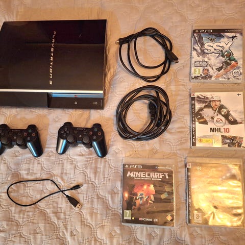 Playstation 3 kahdella ohjaimella sekä tarvittavilla kaapeleilla. Alkuperäinen paketti ja kaikki uutenakin pakettiin kuuluvat piuhat ja ohjeet mukana.
