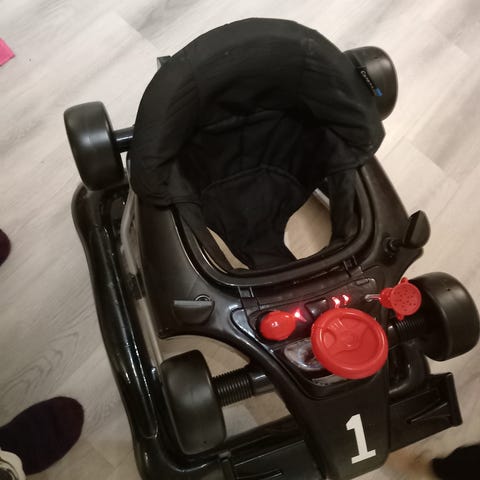 Kävelykärry ja puupalikoita.