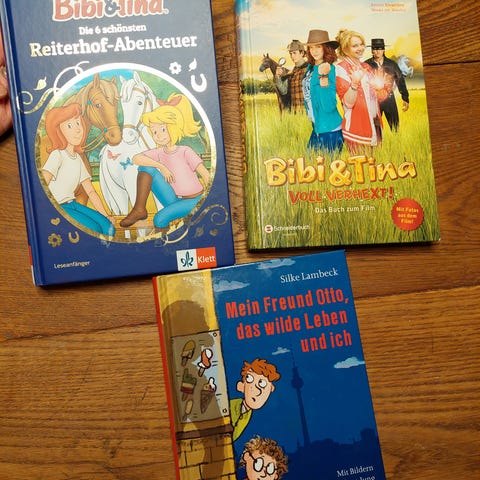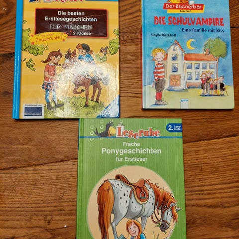 Kolme lastenkirjaa saksaksi, sisältäen erilaisia tarinoita ja kuvituksia. Kirjat soveltuvat lukemaan opetteluun ja varhaiseen lukemiseen. Kirjat ovat värillisiä ja sisältävät kuvitettuja sivuja, joissa on lyhyitä tekstejä ja kuvia eri aiheista.