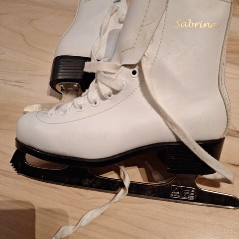 Valkoiset naisten sabrina luistimet koossa 36. Teräsuojat mukaan. Toisen luistimen sivulla musta jälki pinnassa. Ei postitusta.