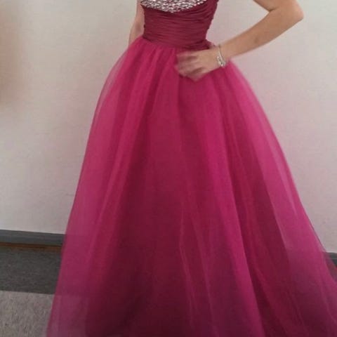 Myydään kerran pidetty vanhojentanssimekko. Tanssija 166cm pitkä, tanssi noin 10cm koroilla. Vannehame oli tanssiessa vuokralla. Nyörit takana sopii noin 34-36 kokoiselle tanssijalle.