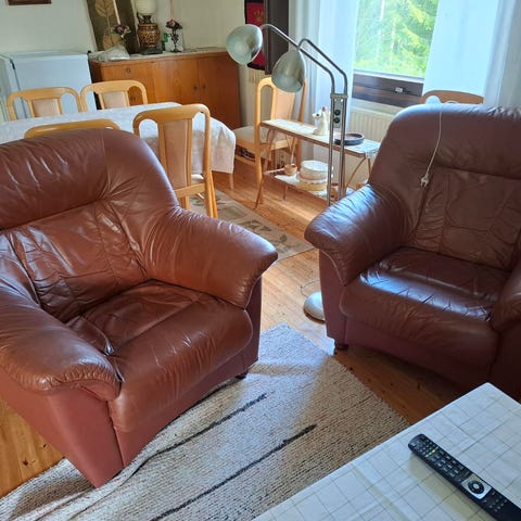 Kahden istuttava nahkasohva ja samaa sarjaa nojatuoli. Sohvan ulkoleveys 150cm ja nojatuoli 100cm. Nouto Klaukkalasta. Maksu käteinen tai mobilepay.