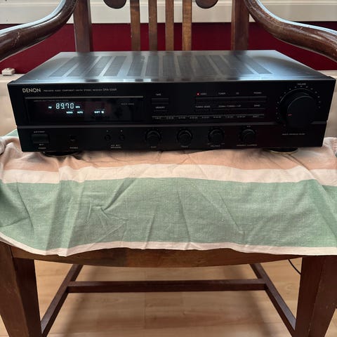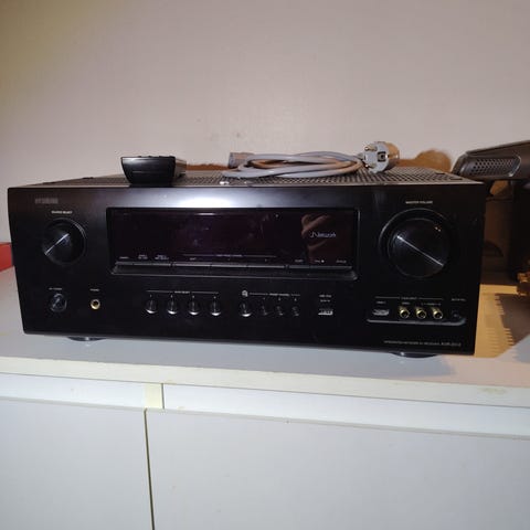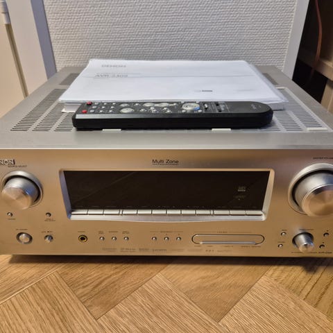 Vahvistin ja kaiuttimet sekä kaukosäädin. Vahvistin on Denon AVR-500 ja kaiuttimet Sonab.