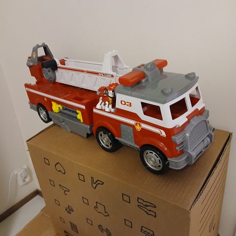 Siistikuntoinen iso Sampan paloauto. Mukana auton sisällä oleva minipaloauto, Samppa ja yksi ammus.