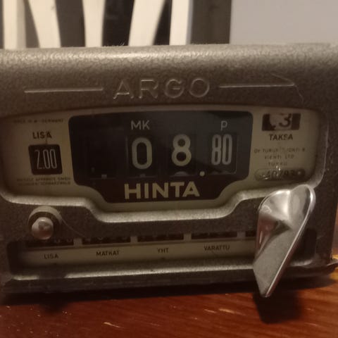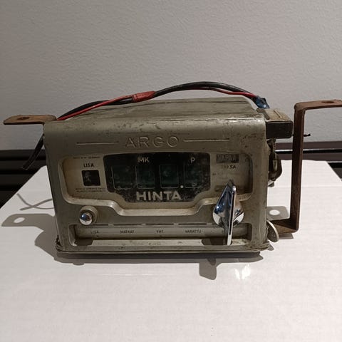 2 kpl Kajaani Oy Minitax-sf taksamittareita sekä parit piuhat, toinen näyttää siltä että siihen yhdistyy auton nopeusmittarinvaijeri ja siitä jako taksamittarille. Toimivuudesta ei varmuutta mutta sitten vaikka museotaksiin rekvisiitaksi. Varmaan sieltä 80-90 luvulta. Hinta mallia molemmat samaan hintaan.