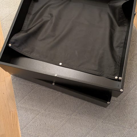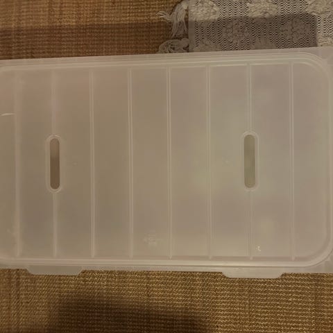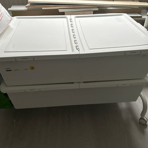 Ikean sängynaluslaatikko. Pieniä kolhuja, mutta kaikki täysin toimivaa. Alla renkaat, niin saa helposti sängyn alle ja pois.