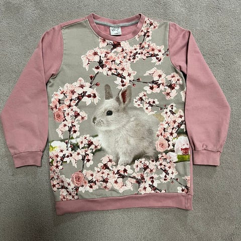 Tytön 140 cm lilahtava pitkämallinen uudenveroinen collagepusero. Hinta 4 euroa. Joensuun keskusta.