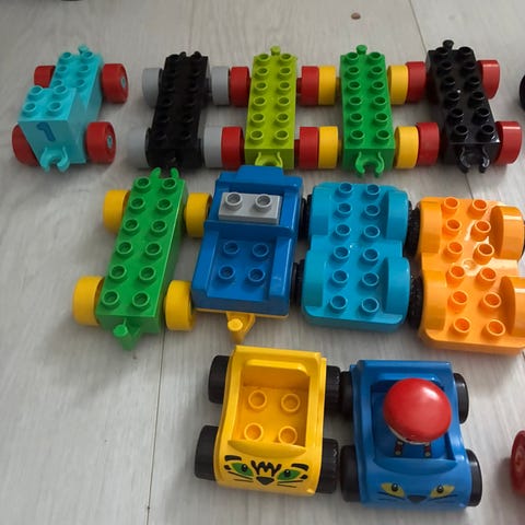 Myydään siistikuntoisia Lego Duplo-settejä kahden ison laatikon verran. Mm. useita autoja ja veturi vaunuineen. Lisäksi 2 rakennusalustaa ja 1 isompi talonrunko.