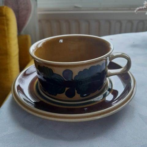 Kaksi teekuppia tasseineen ja pullalautanen. Yhdessä tai erikseen, teekupit 20€/kuppi ja pullalautanen 35€.