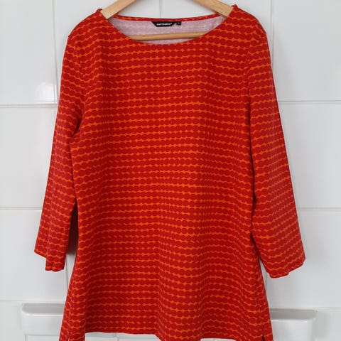 Musta marimekon paita, puuvillaa. Hihansuissa halkiot. En äkkiseltään löytänyt mitään vikoja