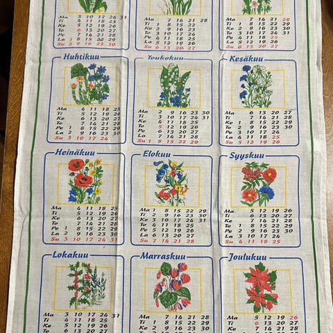 Keittiöpyyhe, kalenteripyyhe, 2001, koirapyyhe. Vuosipyyhe.