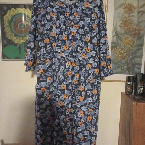 Kokolappu 40/42, reilu. Kai-kai napit kiinni 56 cm, olka-helma noin 102 cm. A-linjainen. 100 % puuvilla, ei jousta. Pyöreä pääntie, kangaspäällysteiset napit koko etumuksen, reilut taskut ja 7/8 hiat. Vyölenkit ja kangasvyö samaa kuosia.