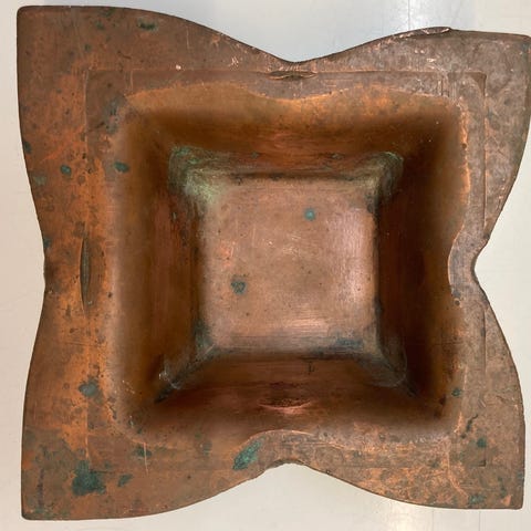 Hopeavanne on tummunut ja aikaa nähnyt, reunassa pieni painauma (Kuvasarjan viimeinen kuva). Se on ilmeisesti liimattu paikalleen uudelleen, muutama liiman valumajälki havaittavissa