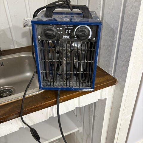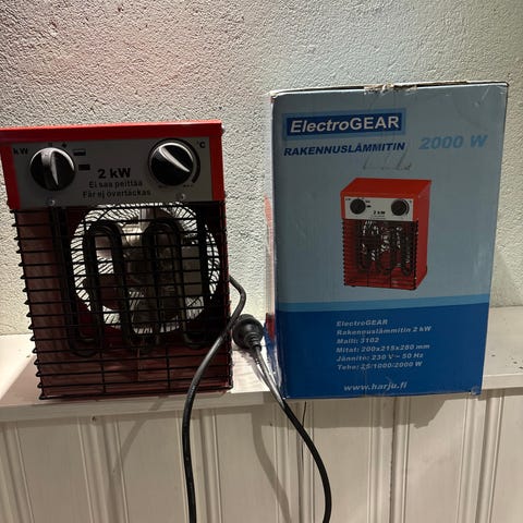 Point sähköinen lämpöpuhallin. Pieni lommo pinnassa ja hieman pölyinen.