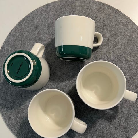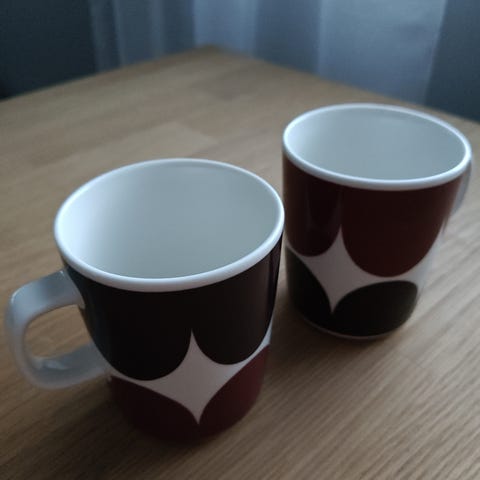 Marimekko Oiva Puolikas muki, jossa on vaaleanpunainen ja valkoinen väriyhdistelmä.
