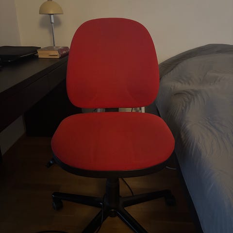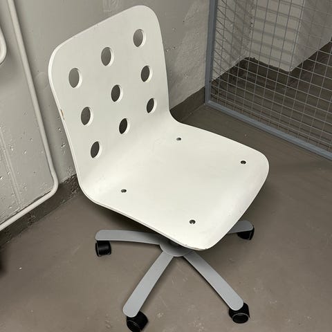 Sironpuoleinen työtuoli. Tuoli on muuten ehjä, mutta alapuolella ollut suojakangas tai mitä lie materiaalia oli, murtui pois ja esille tuli vaneri. Sillä ei ole käyttöön vaikutusta, hieman ruma vaan jos tuolia katselee alhaalta päin. Muuten tuota ei huomaa. Tuoli on aina ollut sisätiloissa.