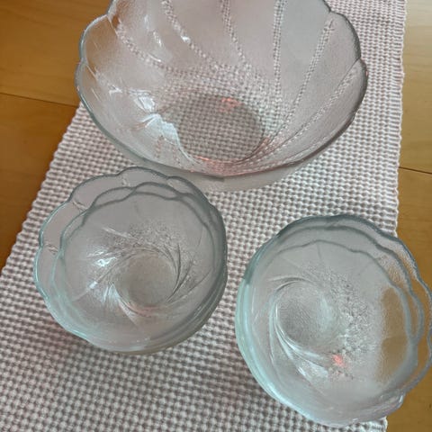 Kirkas lasinen kulhosetti. Iso tarjoilukulho (korkeus 13,5 cm halkaisija 24,5 cm) ja 6 jälkiruokakulhoa (korkeus 6 cm halkaisija 13,5 cm). Vain nouto, maksu noudettaessa käteisellä