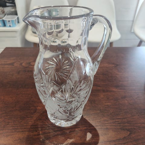 Hyväkuntoinen kristallikarahvi. Halkaisija kahvan kohdalta 14cm ja korkeus korkin kanssa 35cm.