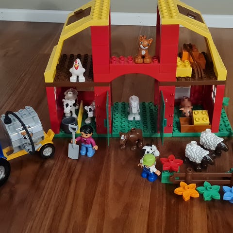 LEGO DUPLO maatila leikkisetti sisältää maatilarakennuksen, traktorin, eläinhahmoja ja erilaisia maatilaan liittyviä tarvikkeita.