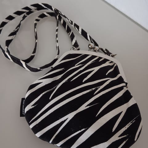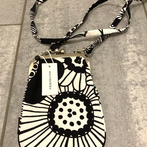 Myyn kerran käytössä olleen Marimekon Rimmi-kukkarolaukun. Mitat noin 14x20 (metallisuklimen kanssa). Väri musta-lumivalkoinen. Kunto:ei käytön jälkiä.