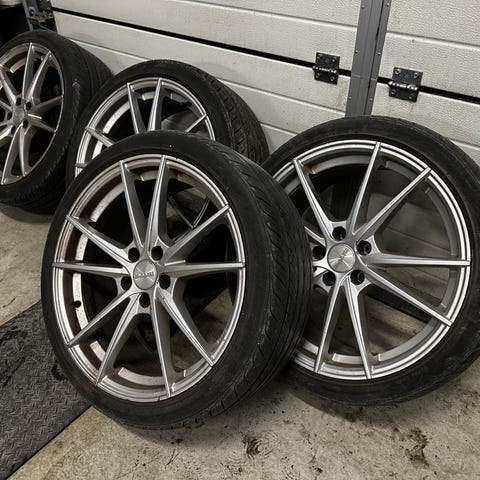 Renkaat vanteilla, koko 255/40 R19, rep audi a8 vanteet MICHELIN CrossClimate 2 kumeilla, vanteet suorat mutta täristää sillä keskireikä epämääräisen kokoinen, pitäisi sorvata sopivaan kokoon soviterenkaalle, kumit itsessään todella hyvässä kunnossa.