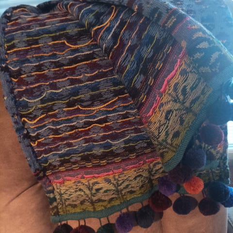 Myydään kaunis kirjoneule (tummansininen pohjaväri) kaulaliina / kaulahuivi, joka on neuletaiteilija Sirkka Könösen tuotantoa. Leveys 25 cm, pituus n.200cm + pompulat. Kunto uudenveroinen, materiaali 100% villaa. Hinta 45 euroa noudettuna / toimitettuna lähialueelle, lähetettynä 52 euroa tai toridiili.