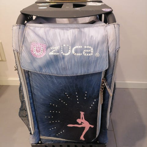 Siisti Züca -vetolaukku. Musta metallikehys ulos vedettävällä teleskooppikahvalla ja vilkkuvilla pyörillä. Kevytmetallinen runko on kevyt nostaa ja vetää