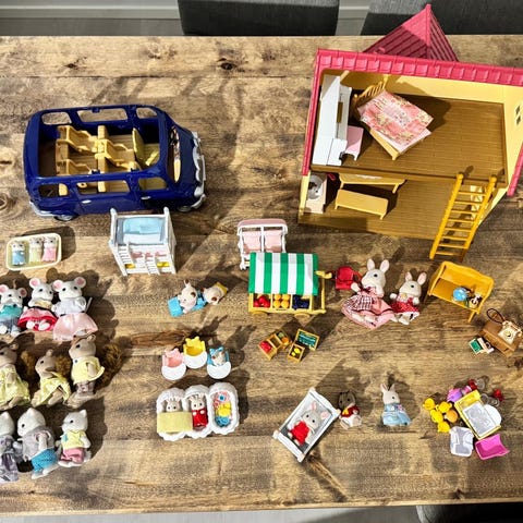 Sylvanian families -lelut: kaksi taloa, päiväkoti, sekalainen seurakunta erikuntoisia huonekaluja, bussi (yksi penkki puuttuu) ja pupu-figuureja. Vain nouto Espoon Nöykkiöstä.