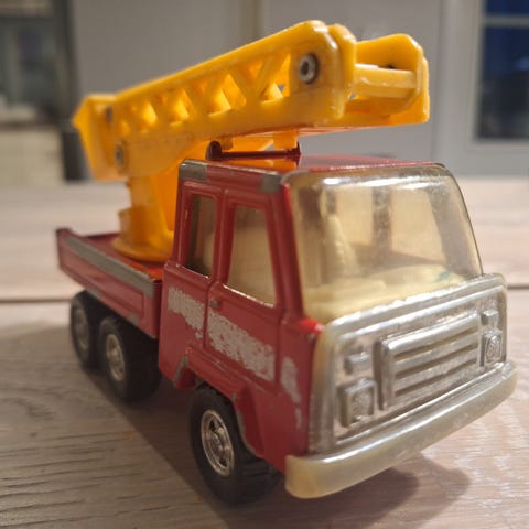 Myydään peltinen, vanha, pieni paloauto 1970-luvulta. Kun vivusta veivaa, niin paloauto ajaa eteenpäin, pysähtyy, nostaa tikapuut hetkeksi ylös ja jatkaa taas sitten matkaansa niin kauan kuin vetoa riittää. Vaikka auto on vanha, niin vielä se kiitettävästi puskee eteenpäin. Toimii. Paloauton pituus on 9 cm ja korkeus on 3,5 cm. Tikapuut ovat 16 cm korkeat. Ne ovat ottaneet osumaa vuosien varrella ja ne ovat ajan patinoimat. Vintage.