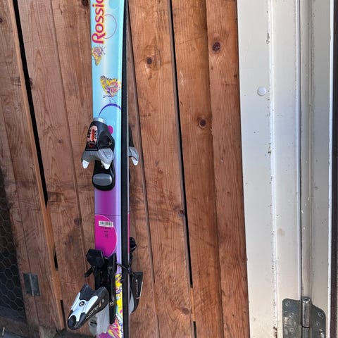 Käytetyt, mutta ok-kuntoiset pienen lapsen sukset. Toisesta etusiteestä lohjennut tuollainen tukipala. Olen liimannut sinne kumityynyn niin ottaa paremmin vastaan monon. Varmaan kannattaa kysyä suksihuollosta voiko sille tehdä mitään.