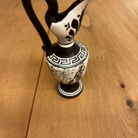 Keramiikkakannu sinisellä pinnalla. Pyöreä muoto ja pieni kahva. Sopii koriste-esineeksi tai pienenä astiana.